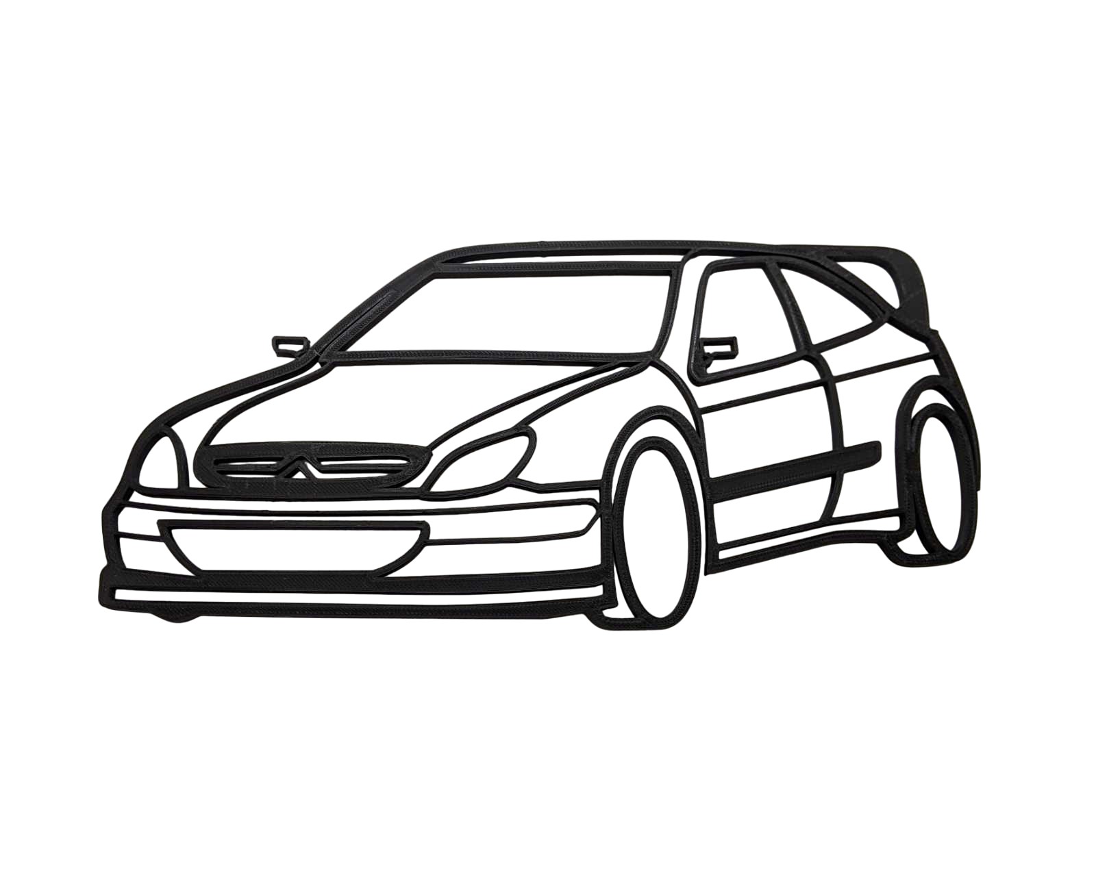Décoration d’une voiture de rallye, la Citroen Xsara WRC imprimée en 3D en PLA noir.
